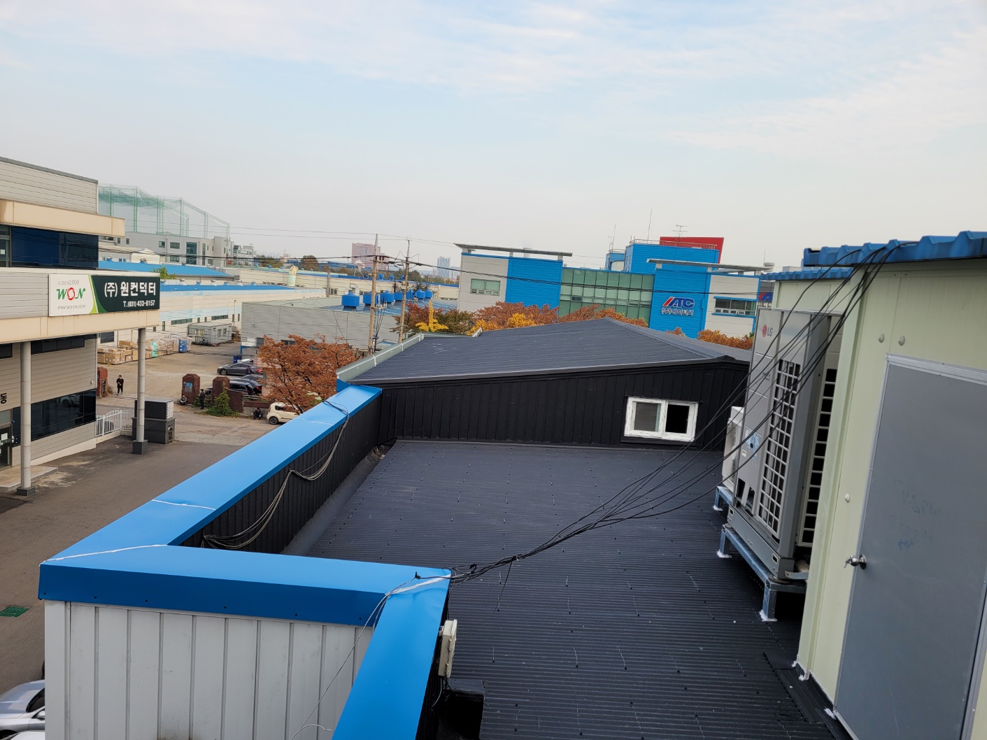 경기 시흥시 정왕동에 위치한 공장으로 노후된 슬라브지붕을 방수와 단열 및 에어컨의 실외기 사용을 위하여 바닥시트형 공법과 슬라브 씌움작업을 병행한 사례임.