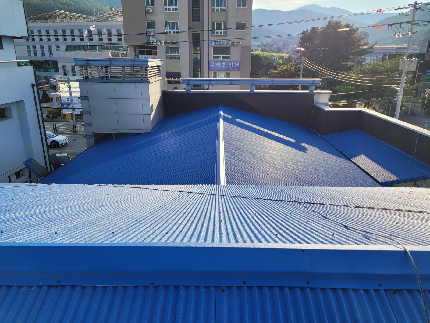 남양주시 수동면 농협하나로마트. 노후된 V250 판넬지붕을 정재,각재로 하지작업후 아연도칼라강판 슬레이트골로 덧시공함