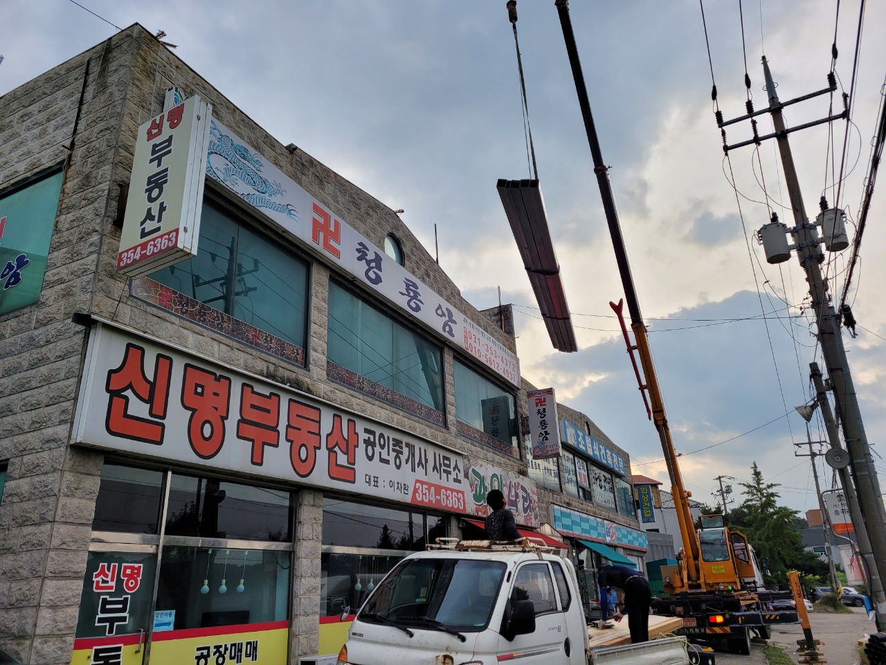 화성시 향남읍. 슬라브지붕이 노후돼 각파이프로 하지작업후 아연도칼라강판 슬레이트골로 개량공사함.