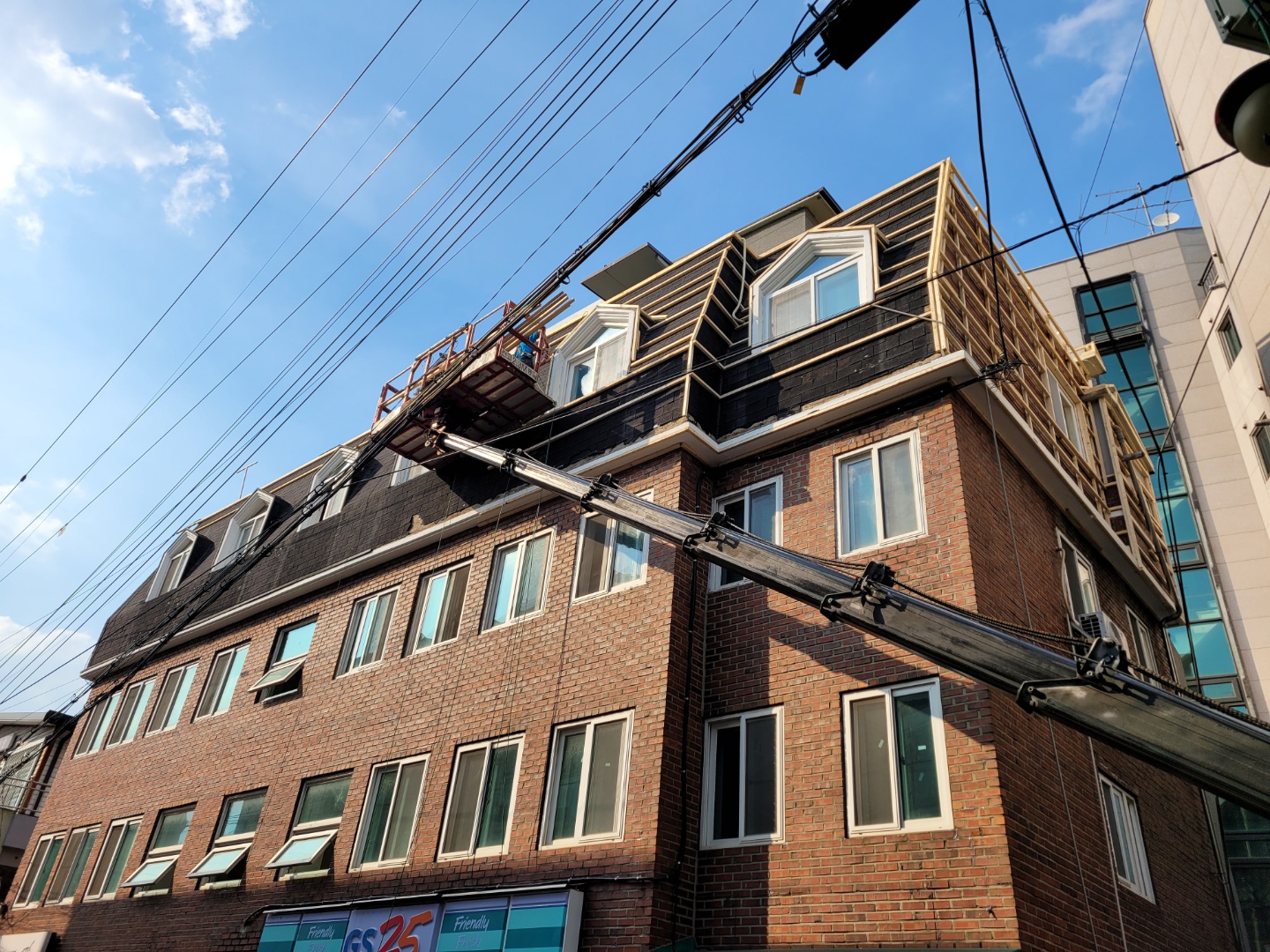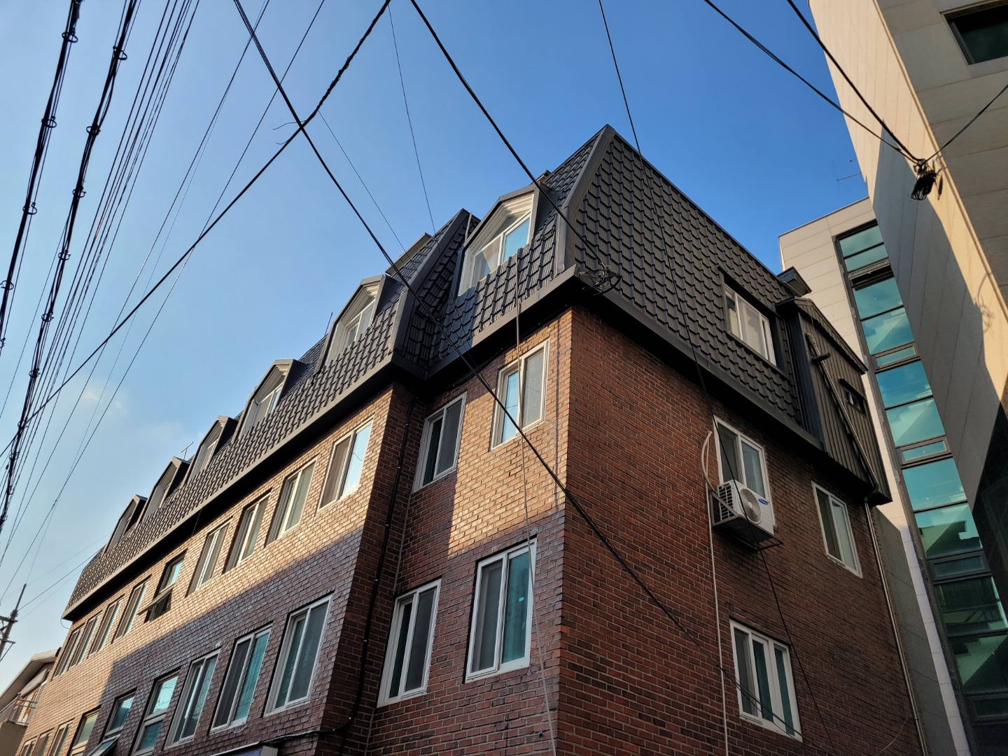 서울시 광진구 자양동. 아스팔트싱글로 된 데스리가 노후돼 칼라강판 평기와골로 지붕개량함.