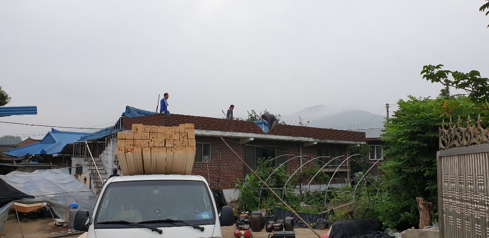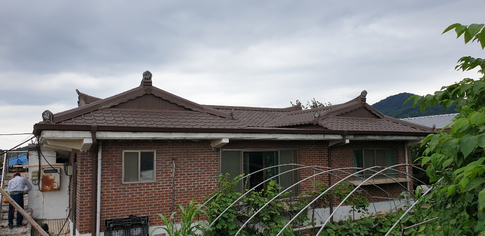 논산시 연무읍 황화정리. 데스리를 철거하고 슬라브위 격자지붕을 칼라강판 평기와골 기와를 사용하여 ㄷ자 지붕으로 개량한 사례임.