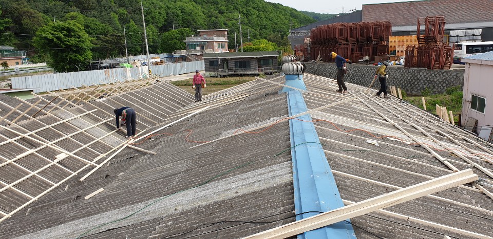 파주시 바랑골길. 슬레이트 지붕을 철거하지않고 칼라아연도 슬레이트골 강판으로 덮어씌워 시공함.