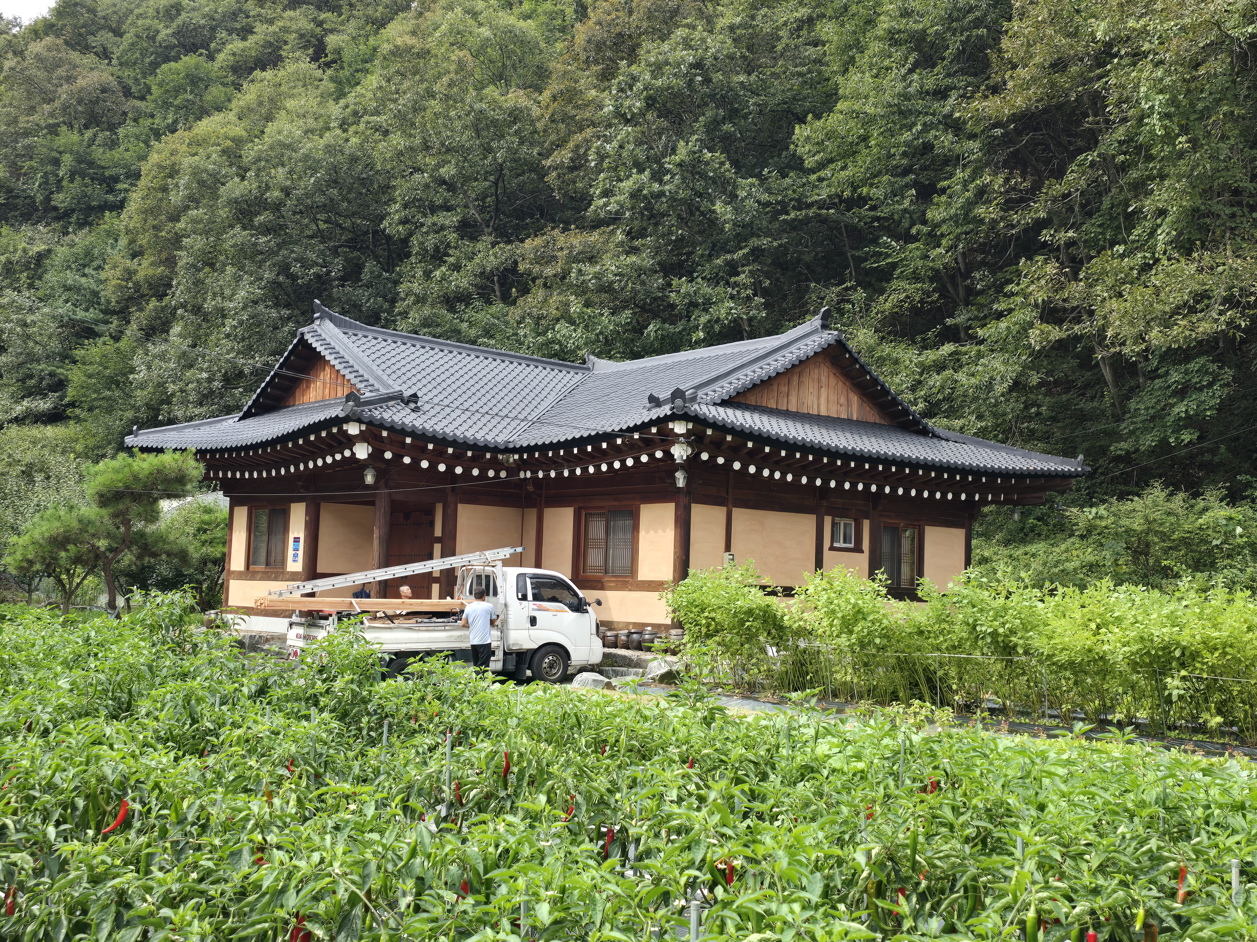홍천군 서면. 비가 새는 전통기와 지붕을 아연도칼라강판 대골 전통기와로 덧방 시공함.